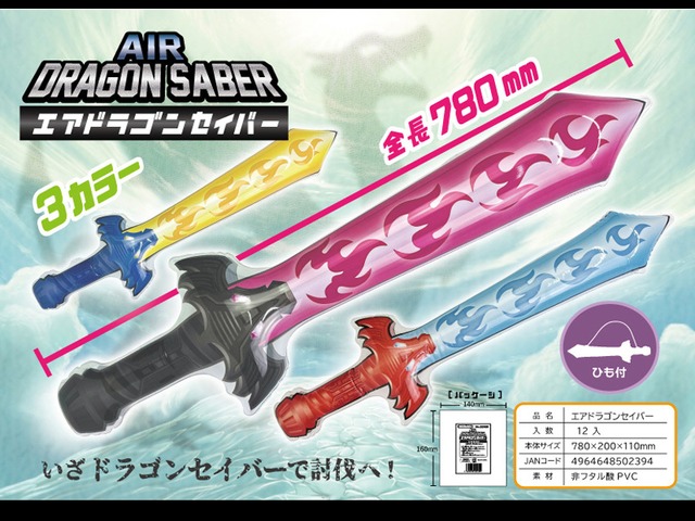 いざドラゴンセイバーで旅へ出発! 78cmのビッグサイズエアーソード「エアドラゴンセイバー」です。 肩に背負える紐つきで、なりきりヒーローごっこ遊びで楽しめます! 本体カラーは全部で3色展開!縁日・お祭り・イベントなどのビニール玩具景品におすすめです❤ ●パッケージサイズ H140×W160×D10mm ●本体サイズ 膨らましたサイズ:約H780×W200×D110mm ●本体色:全3色アソート(両面印刷) / 肩ヒモつき ※商品サイズはあくまで目安です。大きさは入れる空気の量によって変化いたします。 ●個包装 ●12入