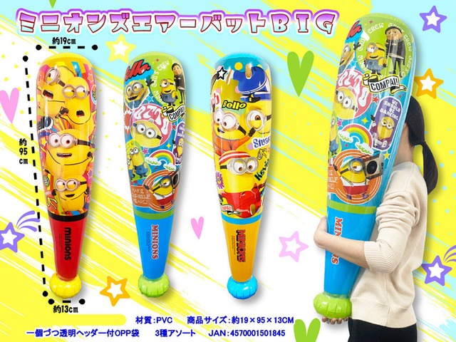 縁日お祭りにピッタリな人気アイテム!【ミニオンズ】のビニールバットです。 こちらのBigバットは約90cmちかくの大きさになるので持ちあげると顔が隠れちゃう程のサイズになります♪ バットの絵柄は全3種類! 縁日・お祭り・イベントの景品に大変オススメです。 ●対象年齢 6歳以上 ●パッケージサイズ 約H220×W210×D25mm ●本体サイズ 膨らましたサイズ:全長約950mm ●備考 ビニールバット:全3柄 ●個包装 ●6入