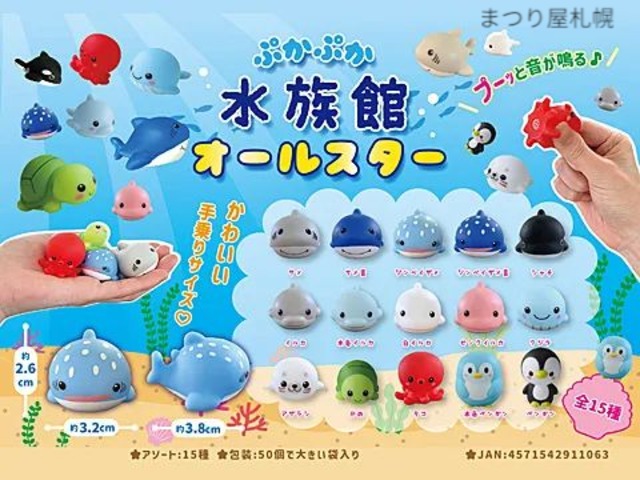 水族館で人気の生き物デザインの「ぷかぷか水族館オールスター」すくい人形です。色々な海の仲間達がいます。 本体を押すと「ぴゅ~」と音が鳴ります。 お祭りの景品や水に浮かべて、すくい遊びにおすすめです。ガチャガチャにもお使いできます。 ●15種類をミックスして、計50個/袋での販売 ●サイズ ジンベイサメ:縦2.6×横3.2×奥行き3.8(単位:センチ)※種類によって異なる。 ●カラー/バリエーション 15種類