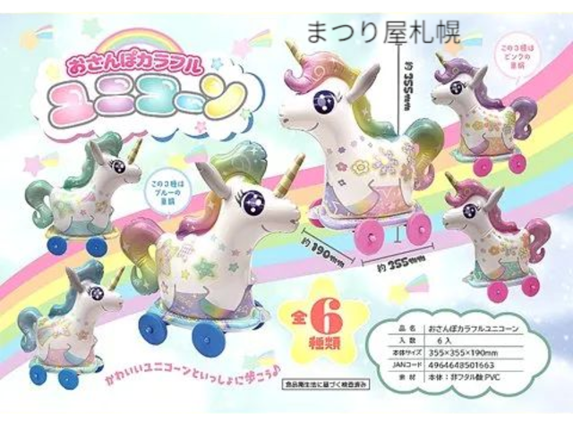 ひもで引いておさんぽコロコロ♥ かわいいユニコーンと一緒にお散歩しよう! お祭りや景品などに大人気です。 ユニコーンの形の引っ張って歩くタイプのビニール玩具 ヒモと車輪がついています。 ●6種類ミックス(色指定不可) ●サイズ:35.5×35.5×19cm 膨らましたサイズは空気の入れ方によって多少変化いたします。
