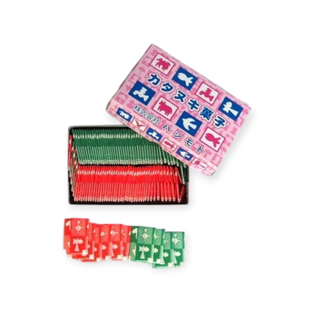 縁日には欠かせない昔懐かしい逸品です。 カタヌキとは、小さな長方形の板状をした菓子の表面に描かれた動物などの型の周囲を、針などを使って割らずに上手に抜き取って楽しみます。 ●原材料 でんぷん・砂糖・ゼラチン・寒梅粉・香料・●着色料(青1、赤3、黄4) ●入り数 100枚入 ●紙巻き