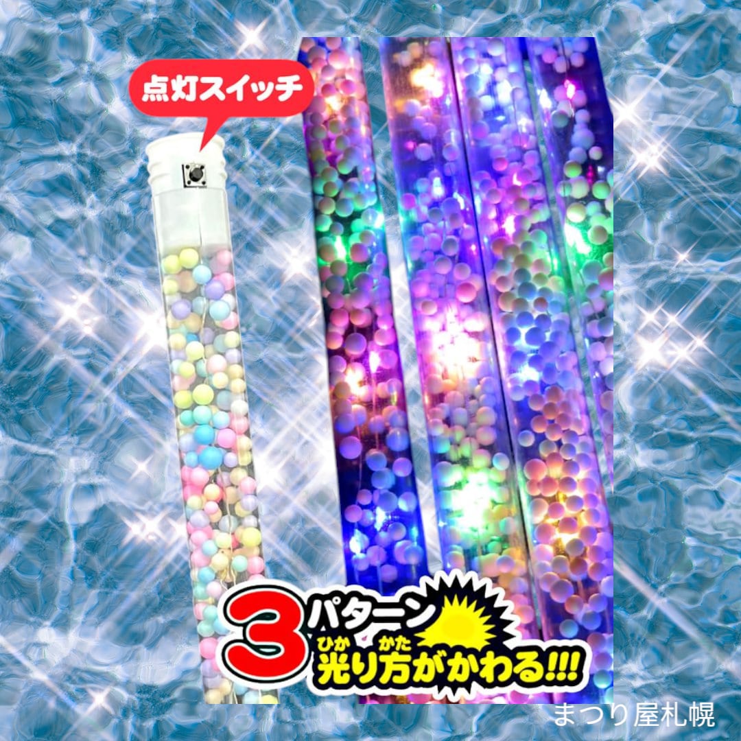 パステルカラーの発砲ビーズがたっぷり入った光るクリアバトンです。
