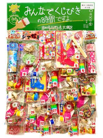 当たり外れの差がない当てくじシリーズより、お手玉に竹とんぼ・万華鏡・ポリバルーン等々…昔懐かしいおもちゃが入ったくじびきです。(内容は変動します)
