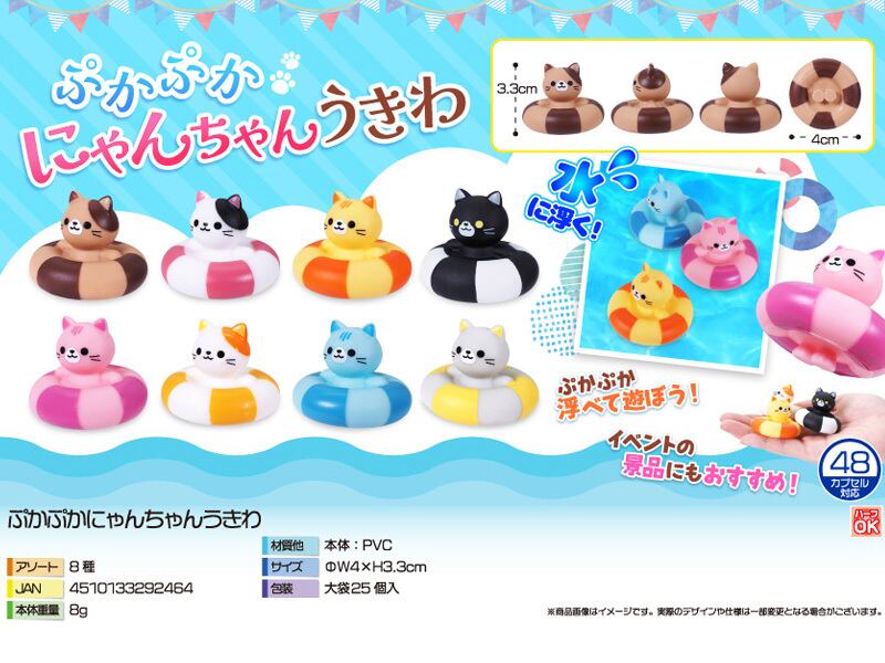 カラフルな浮き輪をつけた猫ちゃんマスコットは全8種類。