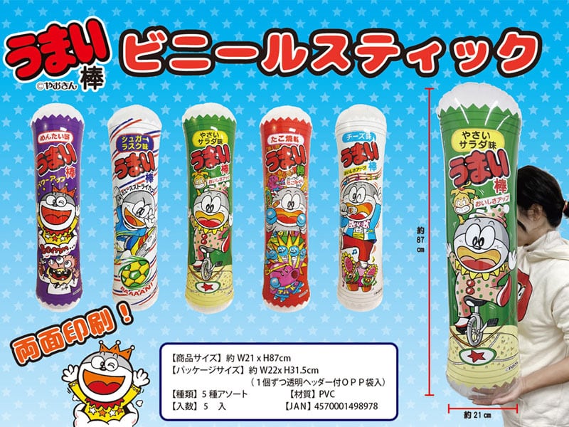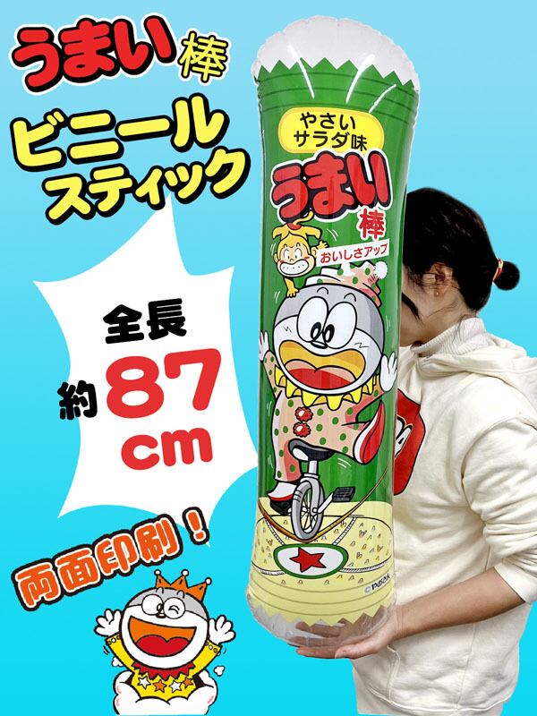 おなじみうまい棒のパッケージを模したスティックは膨らませると約85cmの大きさになります!