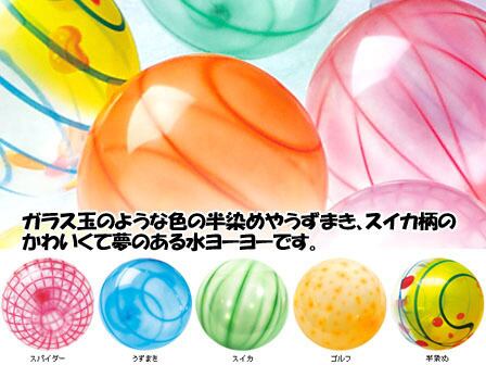 下半分に色がついている「半染」や、風船のゴムの厚みで模様をだす「スイカ・ウズマキ・ゴルフボール・スパイダー」などといった、カワイイ模様付きのヨーヨー風船セットです!