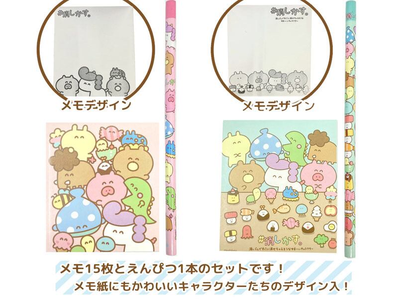 メモ(15枚)とえんぴつ1本のセットです。メモ用紙にもかわいいキャラクターたちのデザインが入っています♪