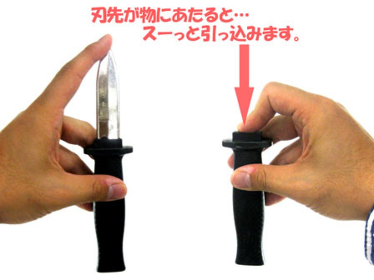 刃の部分は何かにあたるとグリップの中に引っ込む仕組み。まるで刺さったかのように見えるドッキリ玩具です。