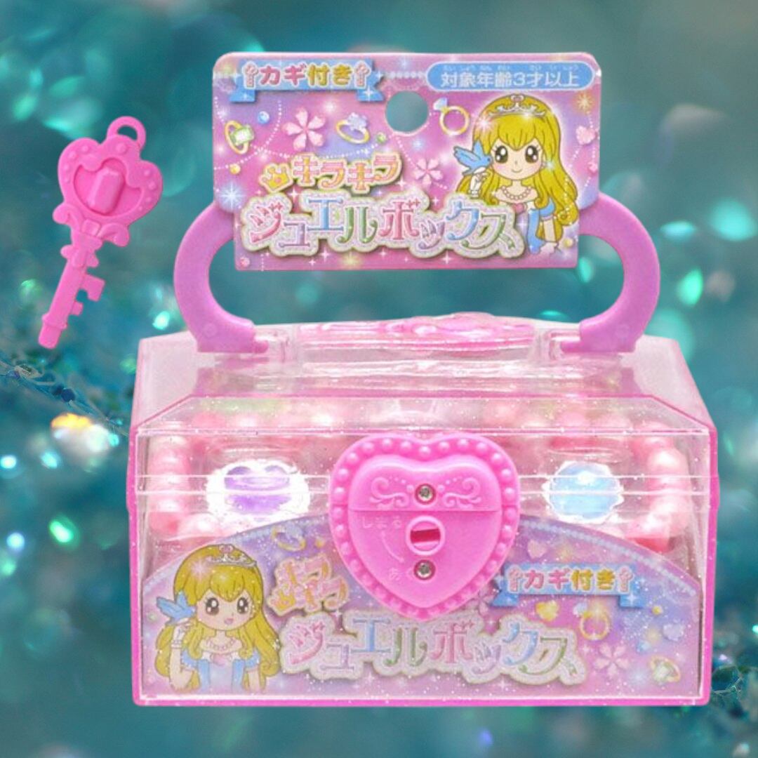 ラメ入りの宝箱ケースの中に指輪やネックレスが入った、おしゃれなジュエルボックスです❤鍵付きです。