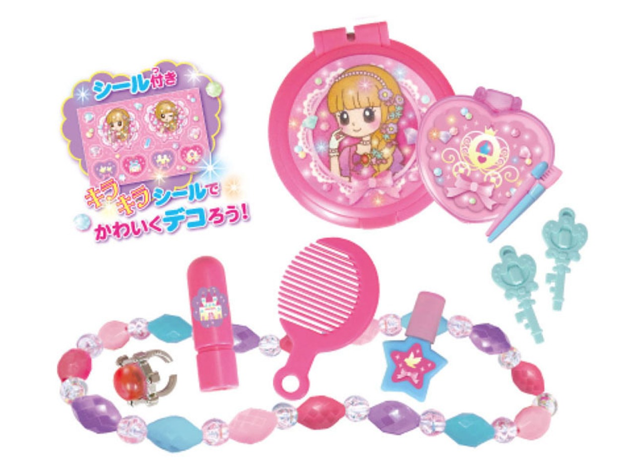 ●<セット内容>ケース×1、カギ×2、アイシャドウ×1、くし×1、ボトル×1、口紅×1、コンパクト×1、ネックレス×1、指輪×1、キラキラシール×1